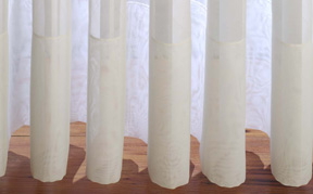 Voál a žaluzie jsou v horní části lamel jednoduše propojeny speciální páskou. Fotografie znázorňují "otevření" a "zavření" systému. V případě nutnosti praní látky se látka jednoduše sejme z lamel - v okně nadále zůstává plnohodnotný stínící systém - PVC vertikální žaluzie.